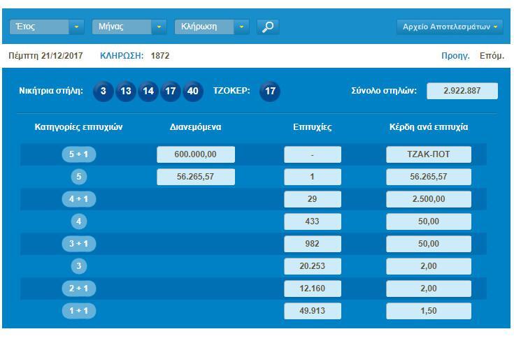 Οι τυχεροί αριθμοί στην σημερινή κλήρωση Τζόκερ (1872) είναι οι εξής: 3, 13, 14, 17, 40