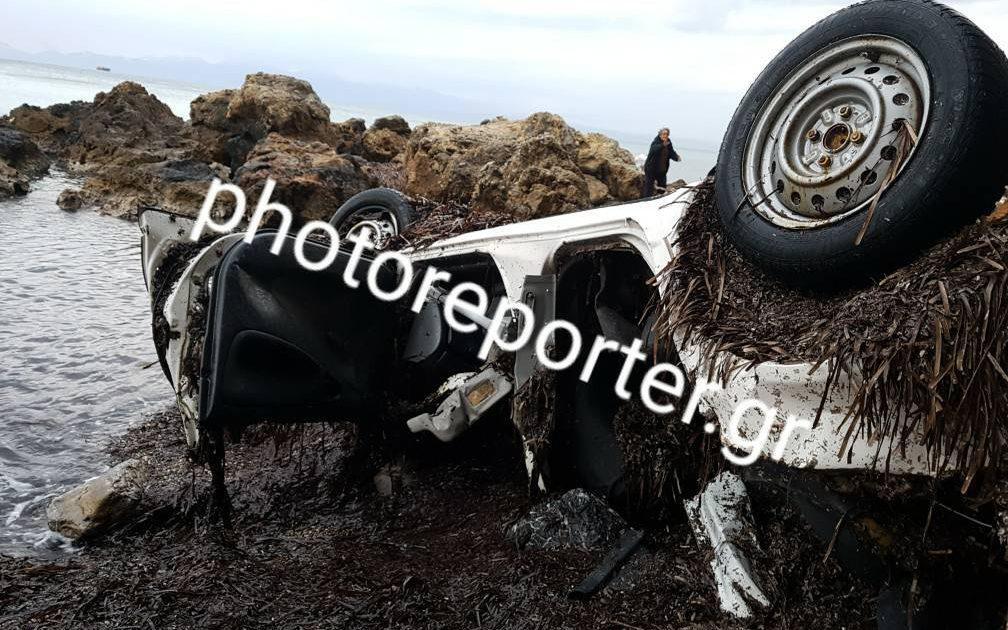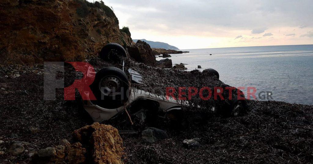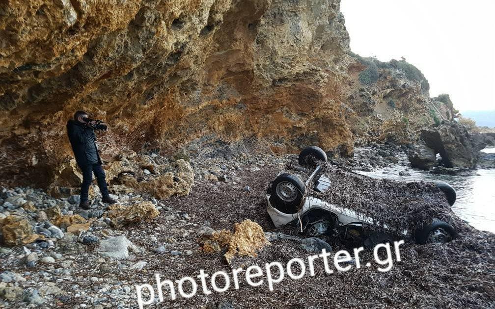Το λευκό Toyota Yaris έκανε «βουτιά» από γκρεμό ύψους περίπου 15 μέτρων προτού καταλήξει στη θάλασσα.