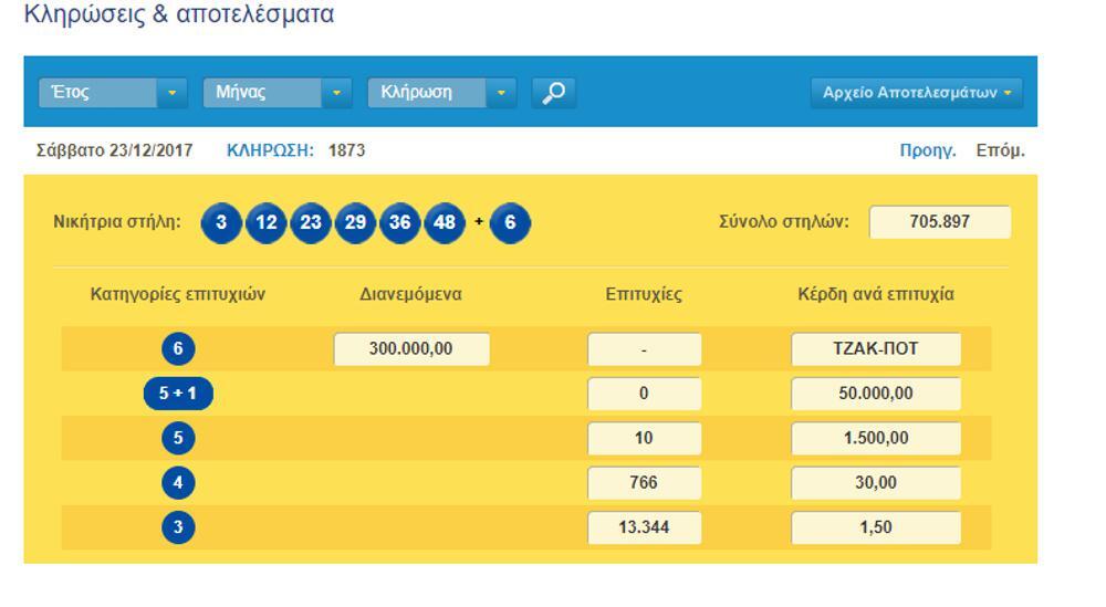 Πραγματοποιήθηκε η κλήρωση του ΛΟΤΤΟ (αριθμός κλήρωσης 1873) όπου σημειώθηκε Τζακ Ποτ και το ποσό των 300.000 ευρώ μεταφέρεται για την επόμενη κλήρωση.