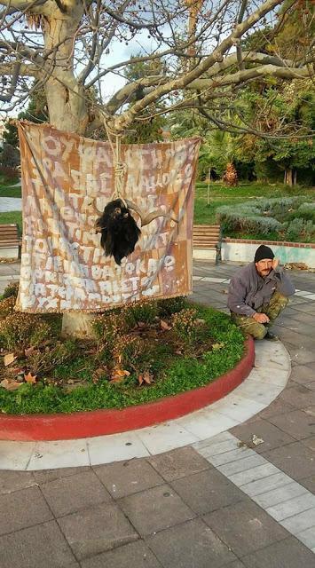 Ο ίδιος σε απόγνωση αμέσως πήρε το κεφάλι του άτυχου ζώου, κατέβηκε στην Μυτιλήνη και με ένα μήνυμα σε πάνο έκανε καθιστική διαμαρτυρία έξω από το Δημοτικό Θέατρο Μυτιλήνης, λίγο πριν τον απομακρύνει η αστυνομία από το σημείο.