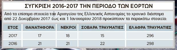 Από τα στοιχεία προκύπτει μείωση στα θανατηφόρα τροχαία κατά 19%, στους νεκρούς κατά 14,3%, στους σοβαρά τραυματίες κατά 31,8% και 0,7% στους ελαφρά τραυματίες. Τα σοβαρά τροχαία ατυχήματα το συγκεκριμένο χρονικό διάστημα ανήλθαν το 2017 σε 14, ενώ το αντίστοιχο του 2016 ήταν 19, δηλαδή μειωμένα κατά 42,1%, ενώ σε ποσοστό 3% καταγράφεται η μείωση στα ελαφρά τροχαία ατυχήματα, καθώς το 2017 είναι 223, ενώ 230 ήταν το 2016. Το σύνολο δυστυχημάτων και ατυχημάτων (Χριστούγεννα και Πρωτοχρονιά) για το 2017 ανήλθε στα 251, ενώ το 2016 ήταν 270, δηλαδή καταγράφεται μείωση της τάξης του 7%. Το σύνολο των παθόντων για το 2017 ήταν 329 άτομα και το 2016 ήταν 341, μείωση κατά 3,5%.