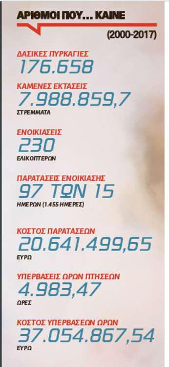 Αυτή τη μοιραία χρονιά, που άφησε πίσω της 63 νεκρούς, η τότε κυβέρνηση προέβη στην ενοικίαση 23 ελικοπτέρων πυρόσβεσης. Από την εταιρία ERICKSON νοικιάστηκαν 4 ελικόπτερα, τα οποία έκαναν 482 ώρες υπέρβαση πτήσης προς 4.806,54 ευρώ την ώρα. Το κόστος εγκατάστασης ήταν 6.291.226, 80 ευρώ για το πολύμηνο και 8.010.900 ευρώ τα υπόλοιπα. Πήραν 14 15νθήμερες παρατάσεις προς 317.858, 63 την καθεμία. Το συνολικό κόστος γι’ αυτά ήταν 22.398.762,02 ευρώ.