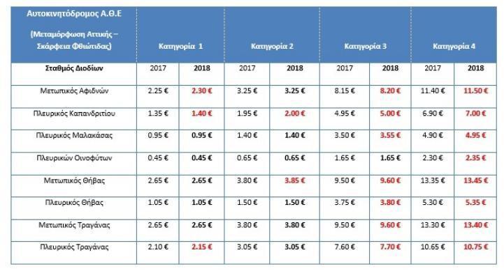 Τα νέα τέλη παρουσιάζονται αναλυτικά ανά αυτοκινητόδρομο, σταθμό διοδίων και κατηγορία οχήματος στους παρακάτω πίνακες.