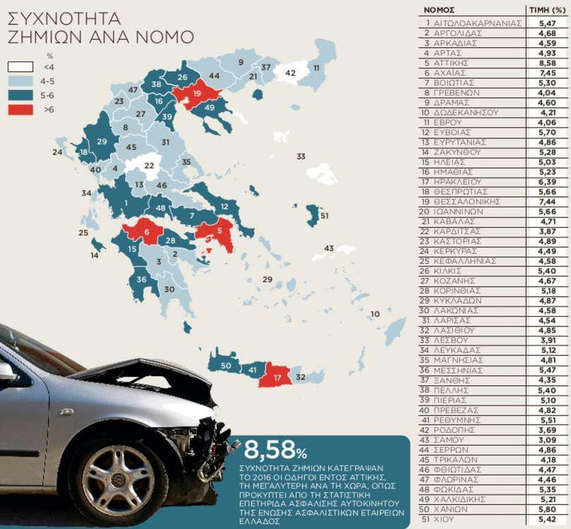 Στον αντίποδα, περισσότερο προσεκτικοί αποδείχθηκαν οι οδηγοί στους Νομούς Σάμου, Ροδόπης, Καρδίτσας και Λέσβου, με τη συχνότητα ζημιών να περιορίζεται σε 3,09%, 3,69%, 3,87% και 3,91%. «Σύμφωνα με τη Στατιστική Επετηρίδα, που συγκέντρωσε στοιχεία από 28 ασφαλιστικές επιχειρήσεις – μέλη, οι οποίες εκτιμάται ότι αθροίζουν το 91% της παραγωγής ασφαλίστρων κλάδου ασφάλισης αυτοκινήτων, οι δηλωθείσες ζημίες (ποσά πληρωθεισών ζημιών και ποσά εκκρεμών αποζημιώσεων) έφθασαν τα 587 εκατ. ευρώ, με το πλήθος των σχετικών καλύψεων να κυμαίνεται σε 419.204. Τα αντίστοιχα μεγέθη για την κάλυψη της αστικής ευθύνης χερσαίων οχημάτων αναφέρονται σε 292.087 δηλώσεις ζημιών, με συνολικό κόστος 495 εκατ. ευρώ», σημειώνει χαρακτηριστικά η ΕΑΕΕ και προσθέτει: «Η μέση ζημία ήταν 1.400 ευρώ έναντι 1.420 ευρώ το 2015, ενώ στην κάλυψη της αστικής ευθύνης 1.695 ευρώ από 1.771 ευρώ τον αμέσως προηγούμενο χρόνο. Το υψηλότερο ποσό καταγράφηκε στη Χαλκιδική (2.658 ευρώ) και το χαμηλότερο στην Καστοριά (1.221 ευρώ)».