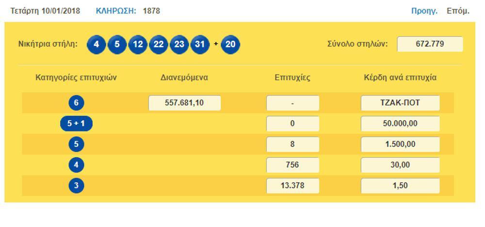 Οι τυχεροί αριθμοί της σημερινής κλήρωσης (1878): 4, 5, 12, 22, 23, 31 και Bonus ο αριθμός 20.