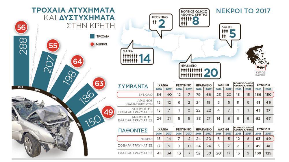 Από τα 150 τροχαία ατυχήματα του 2017, τα 40 σημειώθηκαν στο νομό Χανίων, 7 στο νομό Ρεθύμνου, 68 στο νομό Ηρακλείου, 20 στο νομό Λασιθίου και 15 στο Βόρειο Οδικό Άξονα Κρήτης. Από αυτά, τα 12 θανατηφόρα σημειώθηκαν στο νομό Χανίων, 2 στο Ρέθυμνο, 19 στο Ηράκλειο, 5 στο Λασίθι και 8 στο Βόρειο Οδικό Αξονα. Σοβαρά τροχαία καταγράφηκαν 7 στο νομό Χανίων, 0 στο Ρέθυμνο, 22 στο Ηράκλειο, 7 στο Λασίθι και ένα στο ΒΟΑΚ. Τα στοιχεία για τα τροχαία με ελαφρά τραυματίες είναι 21 στα Χανιά, 5 στο Ρέθυμνο, 27 στο Ηράκλειο, 8 στο Λασίθι και 6 στο ΒΟΑΚ.