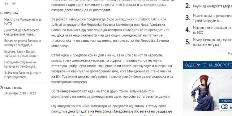 Εντύπωση προκαλεί η δήλωση του Σκοπιανού διαπραγματευτή, Ναουμόφσκι (είναι της τάσης του υπερεθνικιστή Γκρούεφσκι), ο οποίος φέρεται να δήλωσε σε ΜΜΕ της ΠΓΔΜ: «Η χώρα μας έχει όνομα, είναι η Δημοκρατία της Μακεδονίας, το όνομα που είναι η βάση της ταυτότητάς μας. Το 2018 κανείς δεν μπορεί να αρνηθεί την ύπαρξη των Μακεδόνων και της μακεδονικής γλώσσας. Ο Νίμιτς παρουσίασε σήμερα ιδέες και είναι μακριά από μια αξιοπρεπή λύση. Τις προτάσεις θα τις παρουσιάσουμε και θα πάρουμε θέση».
