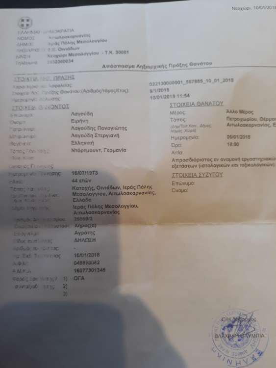 Το protothema.gr δημοσιεύει το έγγραφο της ληξιαρχικής πράξης θανάτου της 44χρονης γυναίκας, σύμφωνα με οποίο ο θάνατός της περιγράφεται ως απροσδιόριστος, εν αναμονή των εργαστηριακών εξετάσεων, δηλαδή των τοξικολογικών και ιστολογικών, που θα ρίξουν φως στην υπόθεση.