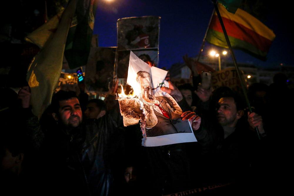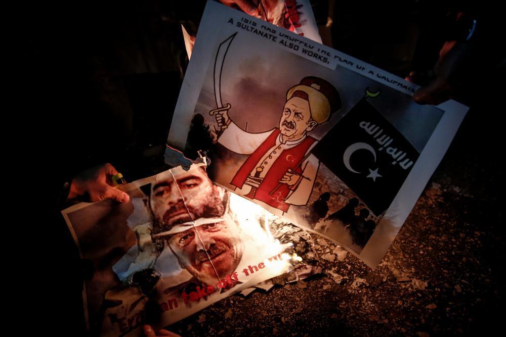 Οι διαδηλωτές φωνάζουν συνθήματα κατά του Ερντογάν και βάζουν φωτιά σε αφίσες που τον απεικονίζουν.