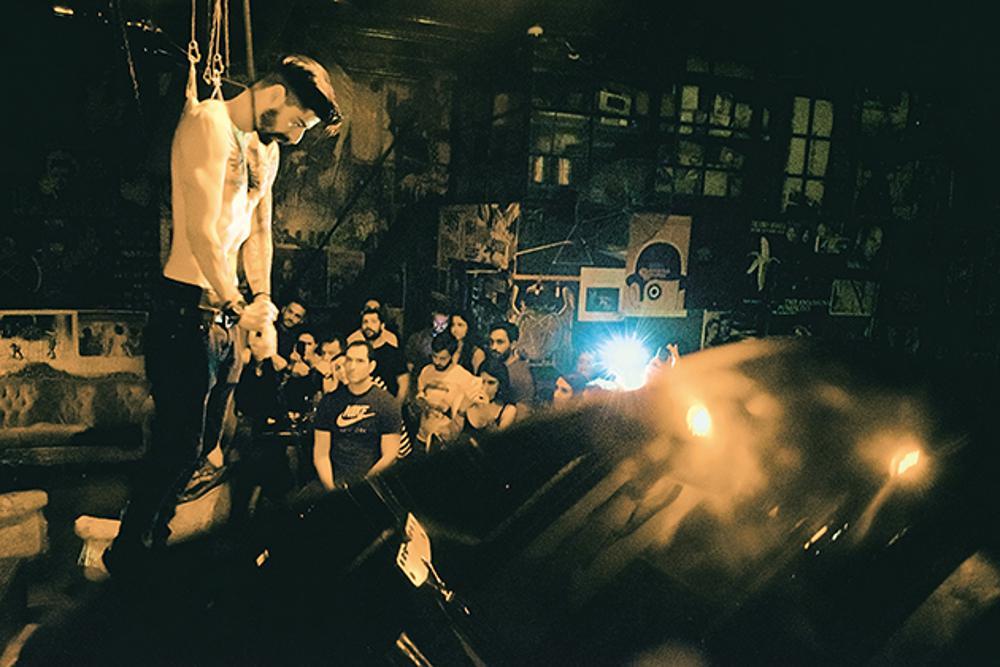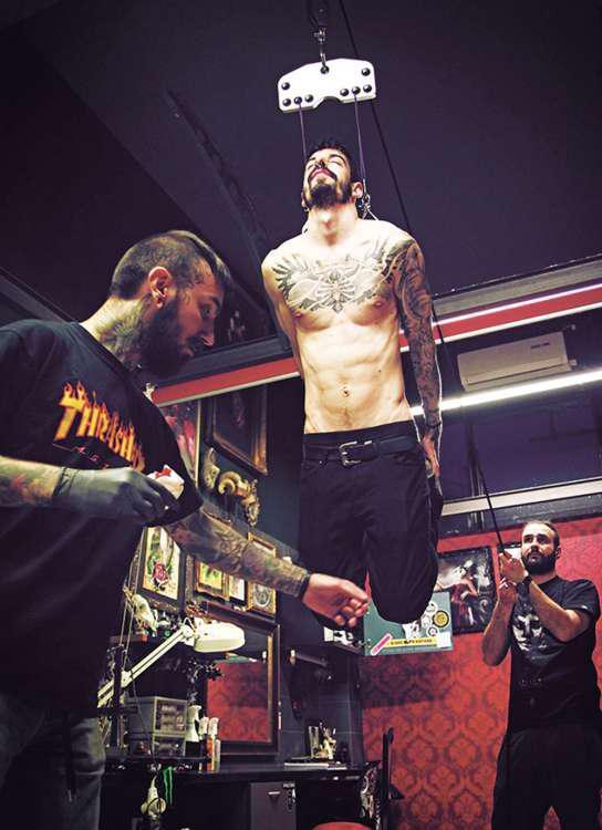 Στο τελευταίο σοκαριστικό μέρος της παράστασης δε ο πρωταγωνιστής σταματάει τον σφυγμό του επί σκηνής (!) για να τον κρεμάσουν με γάντζους από την πλάτη του ώστε ν’ αντέξει τον πόνο! Τότε είναι που τα επιφωνήματα θαυμασμού των θεατών μετατρέπονται σε στριγκλιές φρίκης!