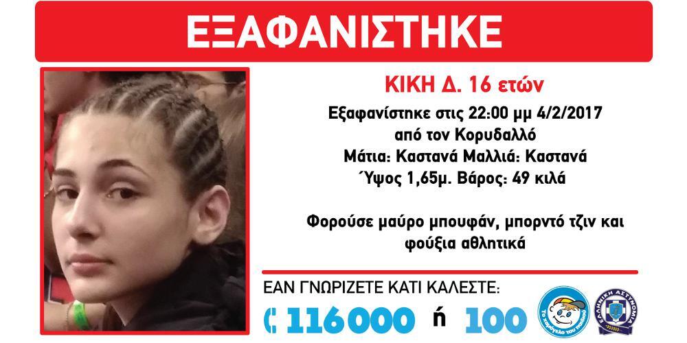 Όπως αναφέρει σε ανακοίνωση του το «Χαμόγελο»: «Στις 04/02/2018 στις 22:00, εξαφανίστηκε από τον Κορυδαλλό, η Κική Δ. 16 ετών. Για την εξαφάνιση της ανήλικης ενημερωθήκαμε από την οικογένειά της, σήμερα 12/02/2018 απογευματινές ώρες.»