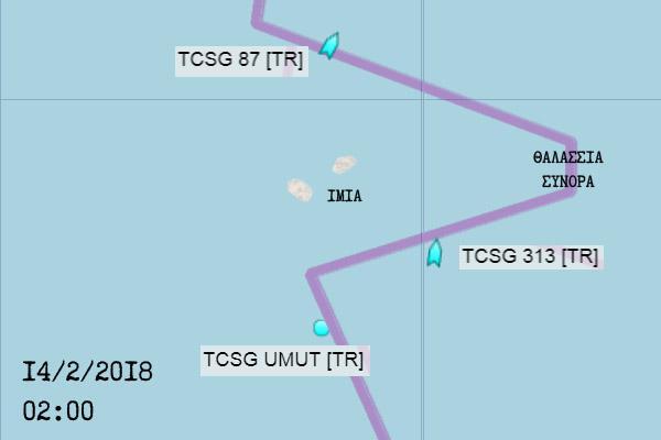 Όπως κατέγραψε η ιστοσελίδα marinetraffic.com, όλη τη διάρκεια της νύχτας απόψε, δύο σκάφη της Τουρκικής Ακτοφυλακής συνέχισαν τις περιπολίες (TCSG 87, TCSG 313) γύρω από τις βραχονησίδες, ενώ επί ώρες παρέμεινε ακινητοποιημένη νότια των Ιμίων, και εντός χωρικών υδάτων της Τουρκίας, η κορβέτα TCSG UMUT που εμβόλισε στις 23:40 της Δευτέρας, το σκάφος «Γαύδος» του Λιμενικού Σώματος.