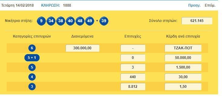 Οι τυχεροί αριθμοί της σημερινής κλήρωσης[κλήρωση 1888]: 09,34,38,40,48,49,01 και Bonus ο αριθμός 39.