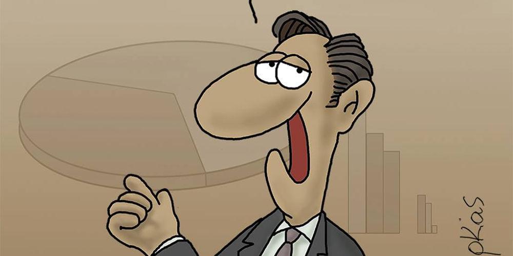 Ο «παρουσιαστής ειδήσεων» που χρησιμοποιεί ο σκιτσογράφος παρουσιάζει τα ευρήματα της «δημοσκόπησης» μετά το ερώτημα «πώς βλέπετε το μέλλον της χώρας;».