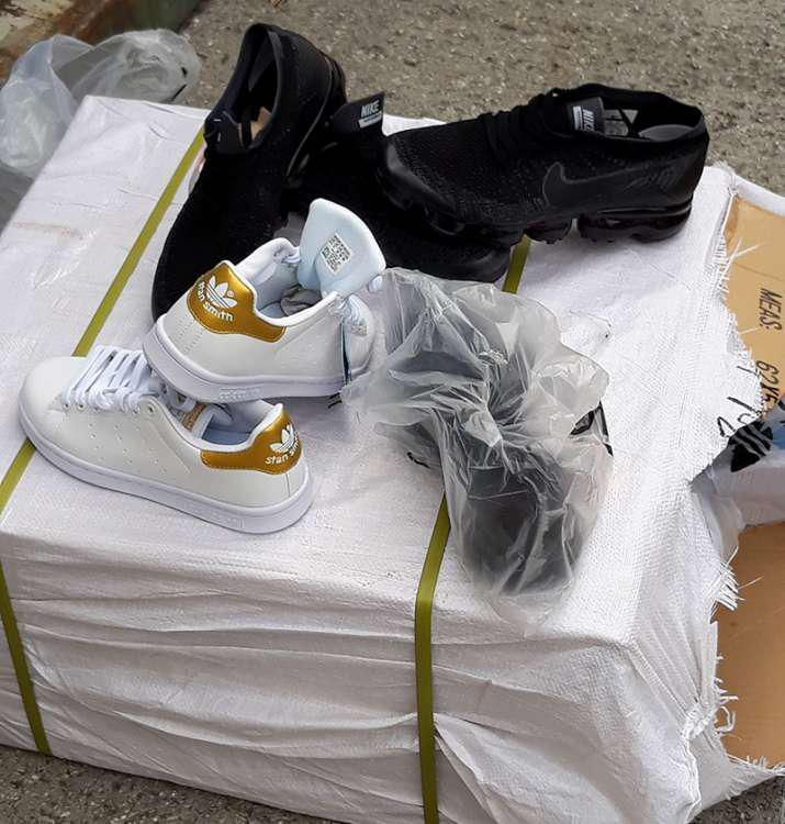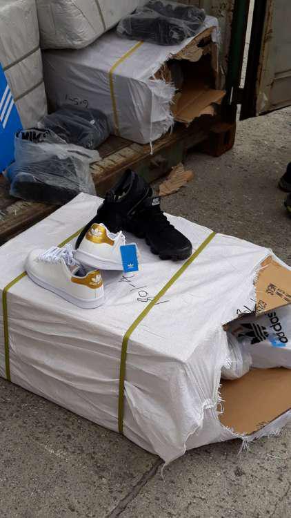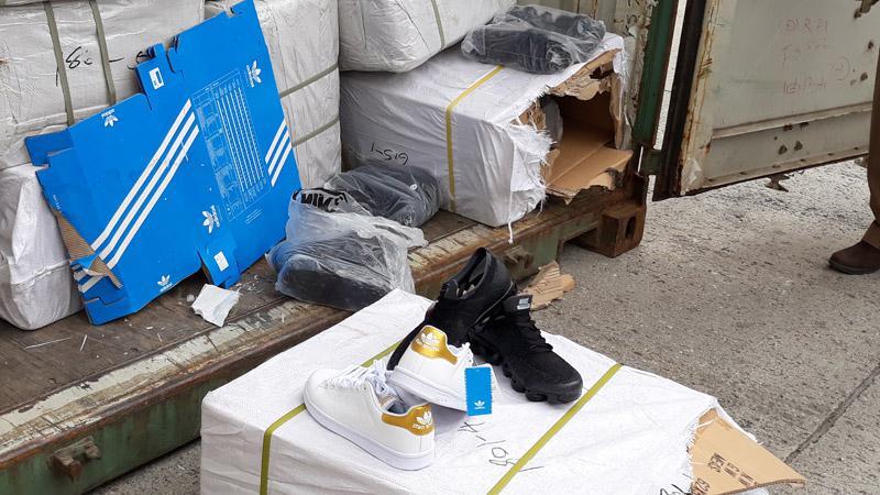 Αν και δεν έχει γίνει ακόμα καταμέτρηση, υπολογίζεται ότι το ένα από τα δύο εμπορευματοκιβώτια περιέχει περίπου 490 χαρτοκιβώτια 14.000 απομιμητικά παπούτσια και άλλα τόσα με ρούχα το δεύτερο.