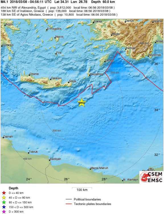 Και η προκαταρκτική αυτόματη λύση του του Γεωδυναμικού Ινστιτούτου Αθηνών δίνει το σεισμό στα 4,1 Ρίχτερ. Το εστιακό βάθος του σεισμού υπολογίζεται στα 60χλμ. σύμφωνα με το EMSC. Το ακριβές επίκεντρο της δόνησης εντοπίζεται 188χλμ. νοτιοανατολικά του Ηρακλείου.