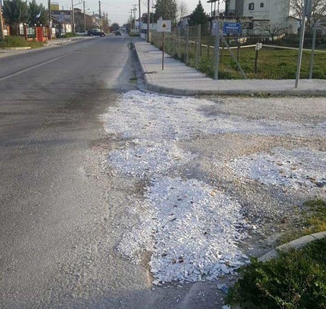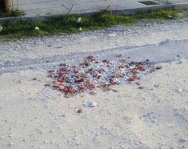 Αφού μάζεψαν τα… προϊόντα του… περασμένου ξεφαντώματός τους, δηλαδή τα δεκάδες σπασμένα πιάτα και γαρύφαλλα, τα «έστρωσαν» σε διασταύρωση του οδικού δικτύου της περιοχής.