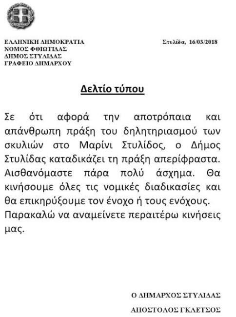 Το περιστατικό καταδίκασε και ο δήμαρχος Στυλίδας, Απόστολος Γκλέτσος. Σε ανακοίνωσή του, τόνισε πως θα κινηθούν όλες οι διαδικασίες για τον εντοπισμό και τη σύλληψη των δραστών.