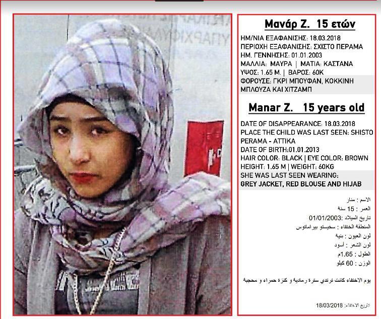 Η 15χρονη Μανάρ έχει ύψος 1,65 μ., είναι 60 κ., έχει μαύρα μαλλιά και καστανά μάτια. Φορούσε γκρι μπουφάν, κόκκινη μπλούζα και μαντίλα χιτζάμπ.