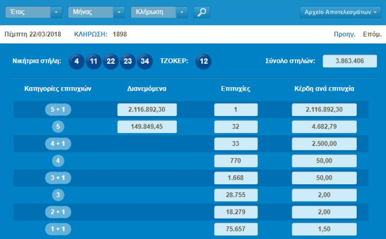 Οι τυχεροί αριθμοί που έβγαλε η (22/3) κληρωτίδα του Τζόκερ είναι οι: 4, 11, 22, 23, 34 και Τζόκερ ο αριθμός 12.