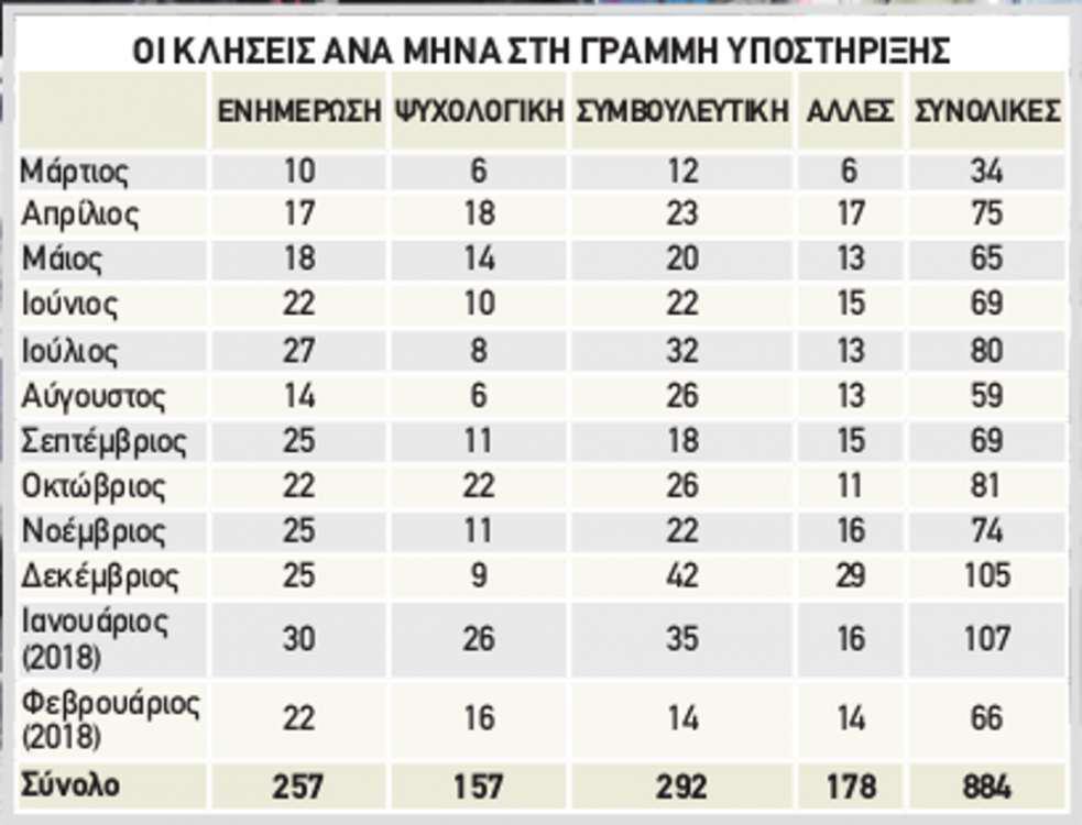 Από τα στατιστικά στοιχεία καταγραφής των κλήσεων διαπιστώθηκε ότι ο Ιανουάριος κατείχε την «πρωτιά» με 107 κλήσεις. Κάλεσαν 41 άνδρες, 54 γυναίκες, 12 «δεν μίλησαν», εκ των οποίων οι 33 ήταν εν ενεργεία, 25 μέλη οικογενειών, 47 φίλοι και συνάδελφοι και 2 συνταξιούχοι. Ενημέρωση και πληροφορίες ζήτησαν οι 30, 26 ψυχολογική υποστήριξη, 35 συμβουλές χειρισμού και 16 άλλες περιπτώσεις βοήθειας. Δύο λιγότερες ήταν οι κλήσεις τον Δεκέμβριο του 2017, που ανήλθαν σε 105, έχοντας παρόμοια ποιοτικά χαρακτηριστικά με τον επόμενο και «πρωταθλητή» μήνα Ιανουάριο του 2018.