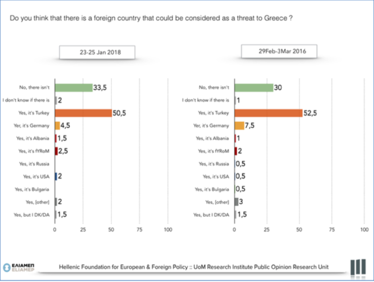 Συγκεκριμένα, έξι στους δέκα Έλληνες θεωρούν ότι υπάρχει ξένη χώρα που απειλεί την Ελλάδα, ενώ μόλις ένας στους τρεις εκτιμά ότι δεν υπάρχει τέτοια απειλή.