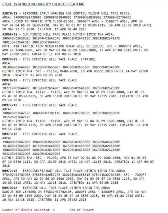 Για την εν λόγω άσκηση, η Τουρκία έχει εκδώσει τις εξής NOTAM: B0973/18, B0977/18, B0978/18 και B0979/18.