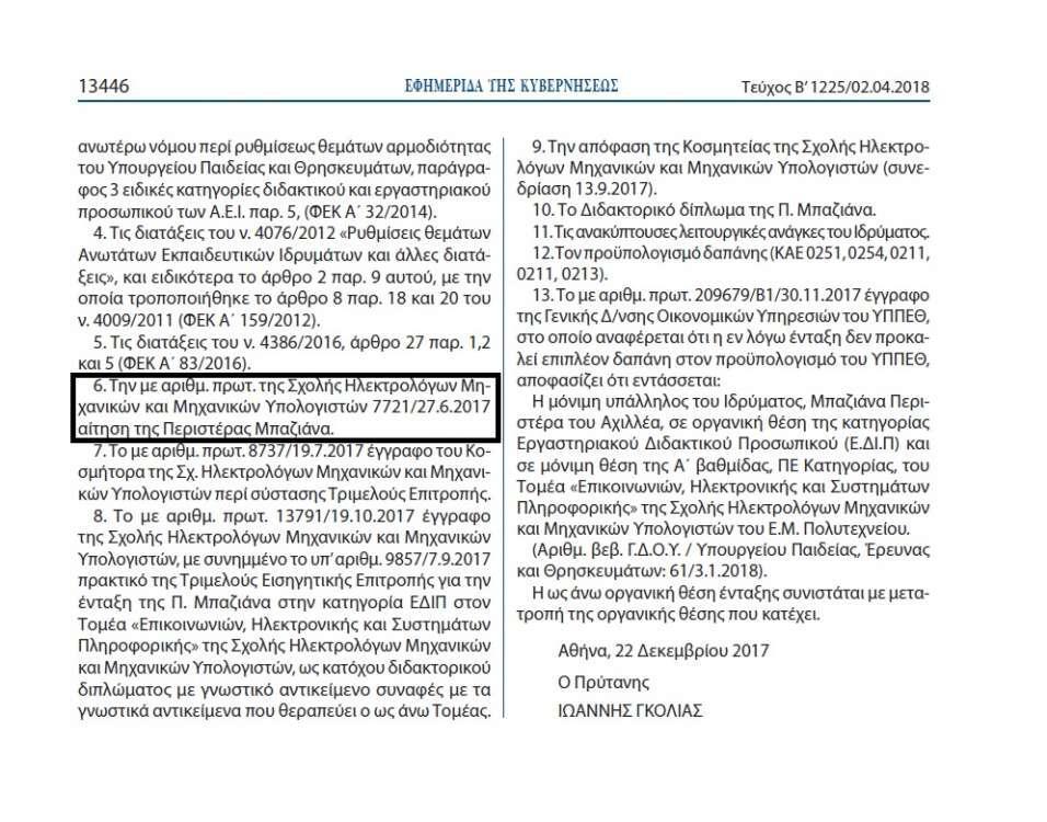 Η μόνιμη υπάλληλος του Ιδρύματος, Μπαζιάνα Περιστέρα του Αχιλλέα, εντάσσεται σε οργανική θέση της κατηγορίας Εργαστηριακού Διδακτικού Προσωπικού (Ε.ΔΙ.Π) και σε μόνιμη θέση της Α ́ βαθμίδας, ΠΕ Κατηγορίας, του Τομέα «Επικοινωνιών, Ηλεκτρονικής και Συστημάτων Πληροφορικής» της Σχολής Ηλεκτρολόγων Μηχανικών και Μηχανικών Υπολογιστών του Ε.Μ. Πολυτεχνείου.