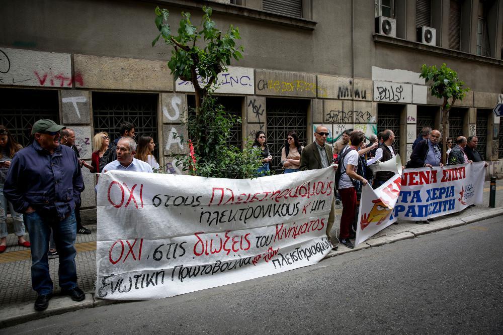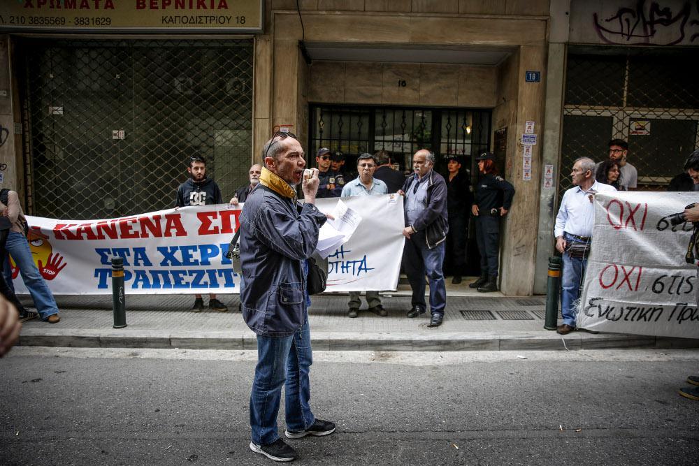 Οι διαδηλωτές κατήγγειλαν ότι “από τους εικοσιεπτά πλειστηριασμούς που γίνονται σήμερα στη Θεσσαλονίκη, ορισμένοι αφορούν μικρά καταστήματα και βιοτεχνικούς χώρους κάποιους και εν λειτουργία και σχετικά μικρά εξοχικά στη Χαλκιδική, που εκπλειστηριάζονται για οφειλές προς τις τράπεζες”.