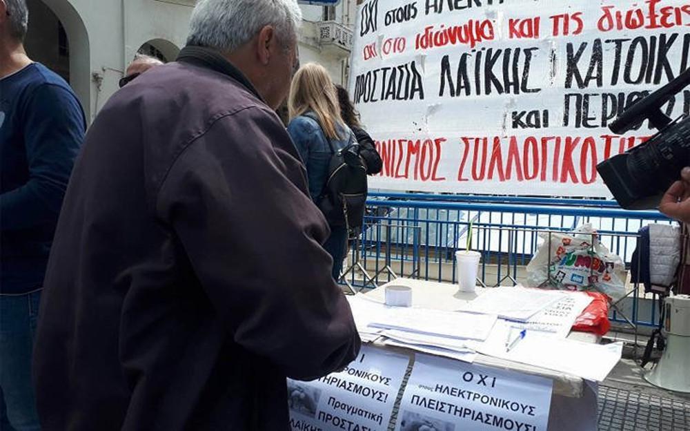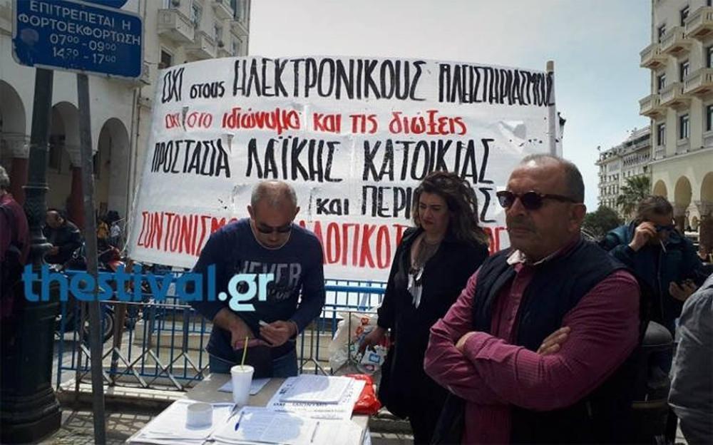 Την ίδια ώρα σε συλλογή υπογραφών κατά των πλειστηριασμών πραγματοποίησαν μέλη του Συντονισμού Συλλογικοτήτων Θεσσαλονίκης, που συγκεντρώθηκαν στην πλατεία Αριστοτέλους στο ύψος της οδού Τσιμισκή και μοίρασαν φυλλάδια με τις θέσεις τους.