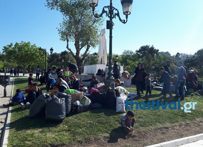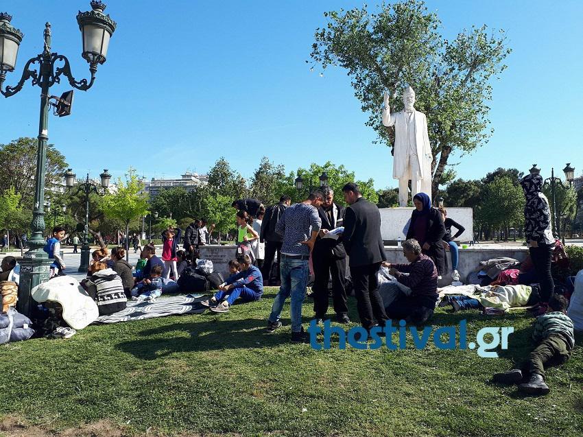 Κουβέρτες, σεντόνια, sleeping bag και μερικά από τα υπάρχοντα τον προσφύγων βρίσκονταν απλωμένα στο γρασίδι μπροστά από το άγαλμα και συνθέτουν ένα σκηνικό, που μοιάζει με καταυλισμό. Άνδρες, γυναίκες, αλλά και οικογένειες με μικρά παιδιά και μωρά έχουν φτάσει στην πόλη από τη Συρία και την Τουρκία, έχουν πάρει το ειδικό έγγραφο που τους επιτρέπει την παραμονή στη χώρα μας, ωστόσο δεν έχουν κάποιο μέρος για να μείνουν.