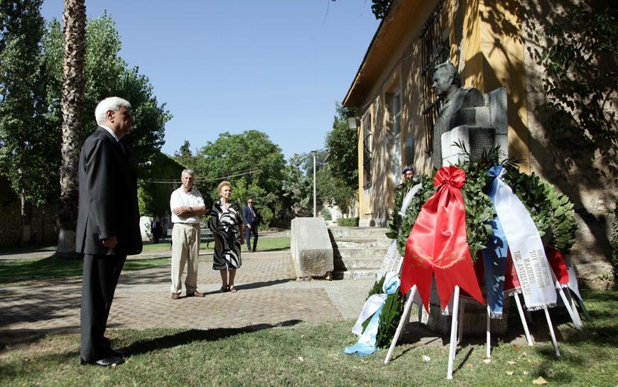 Στεφάνι στην προτομή του Σπύρου Μουστακλή, ο οποίος βασανίστηκε σκληρά από τη χούντα των συνταγματαρχών, κατέθεσε στο πάρκο Ελευθερίας, ανήμερα της 42ης επετείου αποκατάστασης της Δημοκρατίας, ο Πρόεδρος της Δημοκρατίας Προκόπης Παυλόπουλος.
