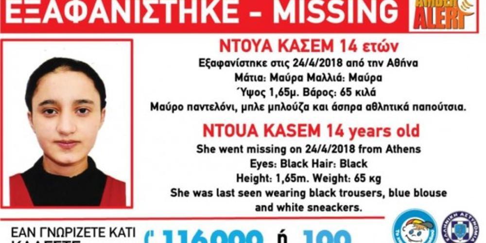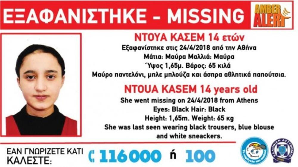 «Στις 24/4/2018 , στις 04:00 η ώρα το πρωϊ, εξαφανίστηκε από την Αθήνα η Ντουά (ον) Κασέμ (επ) 14 ετών.