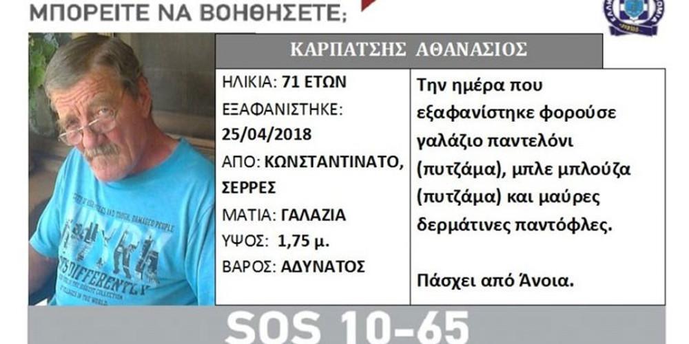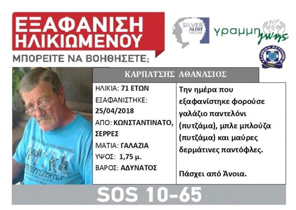 O Αθανάσιος Καρπάτσης την ημέρα που εξαφανίστηκε, φορούσε γαλάζιο παντελόνι (πυτζάμα), μπλε μπλούζα (πυτζάμα) και μαύρες δερμάτινες παντόφλες. Ο 71χρονος πάσχει από άνοια.