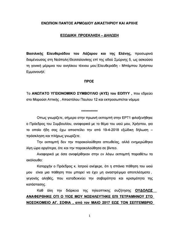 Η μητέρα του, Ελευθεριάδου Β., έμαθε τυχαία ότι έχουν βρεθεί δότες για μεταμόσχευση μυελού των οστών και έπρεπε η ίδια να καλέσει στο αρμόδιο Κέντρο για να επιβεβαιώσει την… είδηση!