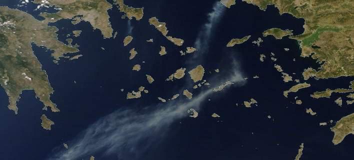 Η φωτογραφία από τον δορυφόρο της NASA δείχνει τον καπνό από την πυρκαγιά της Χίου, που εξαπλώθηκε πάνω από το Αιγαίο κaι έφτασε μέχρι την Κρήτη.