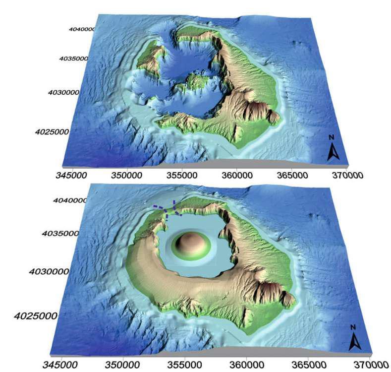 Σύμφωνα με τη νέα μελέτη, μετά την ισχυρή έκρηξη Ρίβα που είχε προηγηθεί της μινωικής, στο προμινωικό τοπίο της Σαντορίνης κυριαρχούσε μια ρηχή πλημμυρισμένη καλδέρα, όπου σιγά-σιγά, καθώς εξέρρεε λάβα από το υποθαλάσσιο ηφαίστειο, άρχισε να ξεμυτίζει η προ-Καμένη. Μέχρι σήμερα μόνο πολύ αβέβαιες εκτιμήσεις μπορούσαν να γίνουν για το μέγεθος και την ηλικία της.