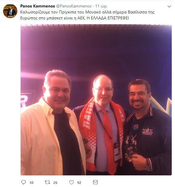 «Καλωσορίζουμε τον Πρίγκιπα του Μονακό αλλά σήμερα Βασίλισσα της Ευρώπης στο μπάσκετ είναι η ΑΕΚ. Η ΕΛΛΑΔΑ ΕΠΙΣΤΡΕΦΕΙ» έγραψε ο κ. Καμμένος.