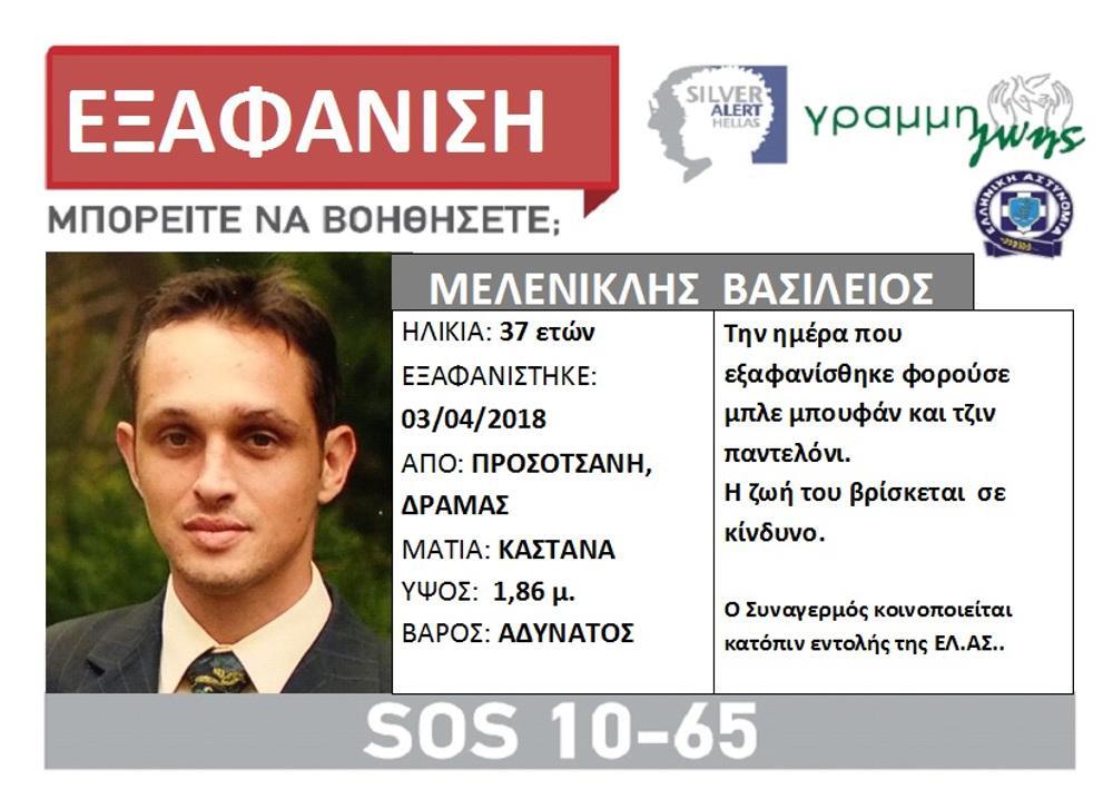 O Βασίλειος Μελενικλής την ημέρα που εξαφανίστηκε, φορούσε μπλε μπουφάν και τζιν παντελόνι. Η ζωή του βρίσκεται σε κίνδυνο.