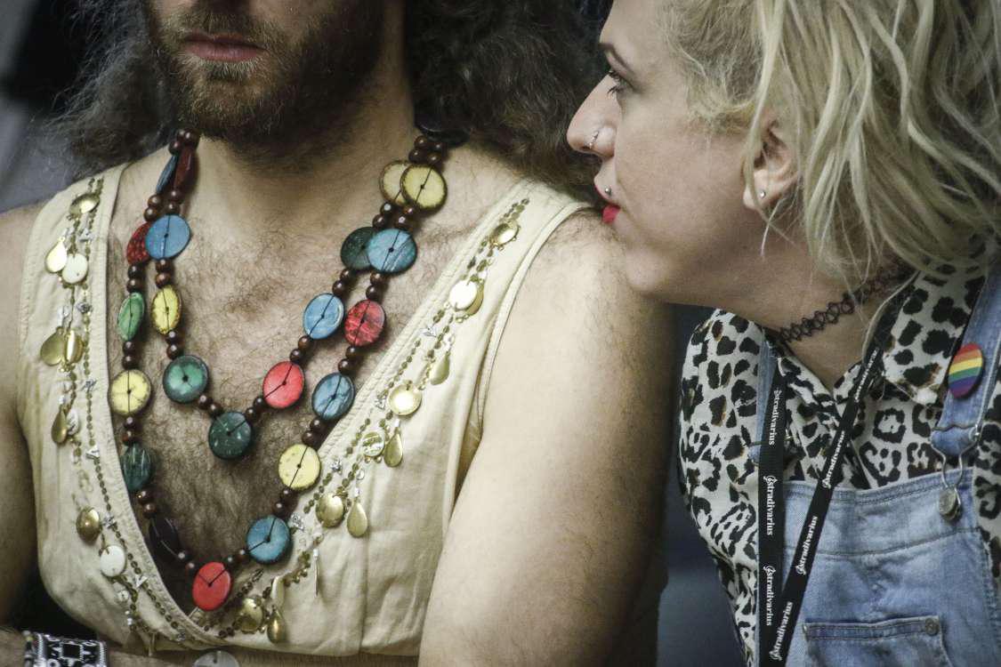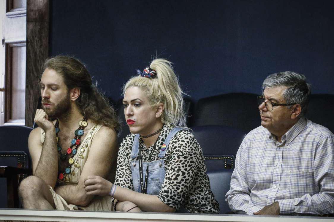 Μαζί με αρκετούς ακόμη εκπροσώπους της ΛΟΑΤΚΙ κοινότητας παρακολουθεί τη συζήτηση για την αναδοχή παιδιών από ομόφυλα ζευγάρια που έχουν συνάψει σύμφωνο συμβίωσης.