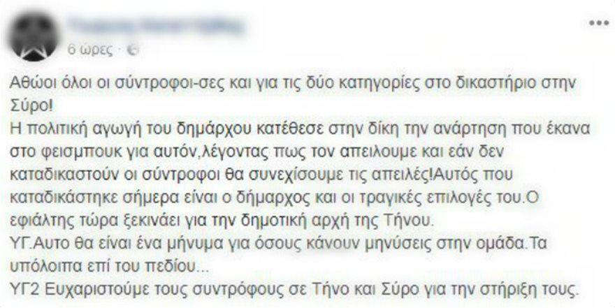 Συγκεκριμένα, λίγη ώρα μετά την απόφαση του δικαστηρίου να αφήσει ελεύθερα τα δέκα μέλη της αναρχικής ομάδας για την επίθεση στο δημαρχείο του νησιού την Πέμπτη, ένα μέλος της αναρχικής ομάδας με ανάρτησή του στο Facebook εκτόξευσε απειλές κατά του Δημάρχου.