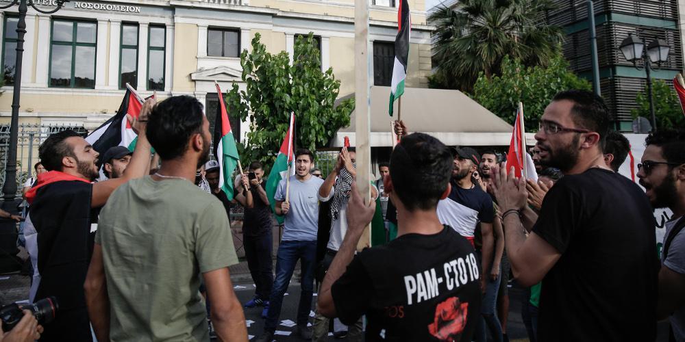 Οι διαδηλωτές συγκεντρώθηκαν στο Μέγαρο Μουσικής και θα πραγματοποιήσουν πορεία προς την αμερικανική και στη συνέχεια προς την ισραηλινή πρεσβεία.