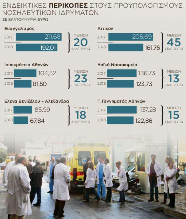Μια απλή αναζήτηση των εγγράφων των προϋπολογισμών των νοσοκομείων είναι ενδεικτική της κατάστασης. Στο Γενικό Νοσοκομείο Αθηνών «Ο Ευαγγελισμός – Οφθαλμιατρείο Αθηνών – Πολυκλινική» ο προϋπολογισμός οικονομικού έτους 2017 διαμορφώθηκε στα 211.681.564 ευρώ. Για το οικονομικό έτος 2018 διαμορφώθηκε στα 192.014.529 ευρώ. Συμπέρασμα: Μειωμένος κατά περίπου 20 εκατομμύρια ευρώ.