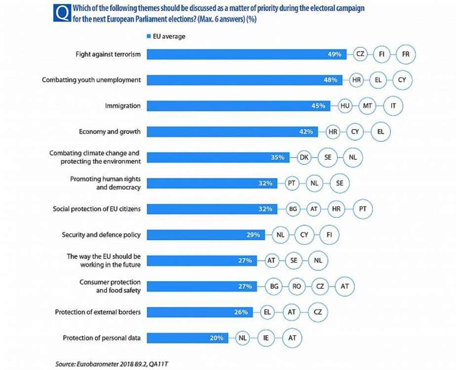 Έτσι ενώ η καταπολέμηση της τρομοκρατίας και της ανεργίας βρίσκονται στην κορυφή της ατζέντας των θεμάτων με τα οποία πρέπει να ασχοληθεί η Ευρωπαϊκή Ένωση, οι Έλληνες πολίτες θέτουν ως προτεραιότητα την οικονομία και την ανάπτυξη (81%) , την καταπολέμηση της ανεργίας στους νέους (76%) και το μεταναστευτικό (με ποσοστό 59%).