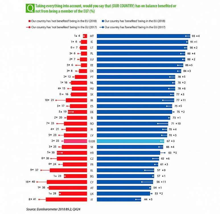 Επιπλέον οι Έλληνες πολίτες θεωρούν σε ποσοστό 45% θετικό το γεγονός ότι η Ελλάδα είναι μέλος της ΕΕ, ποσοστό που αυξήθηκε κατά 11% σε σχέση με την καταμέτρηση της προηγούμενης χρονιάς, ενώ μόλις το 29% δηλώνει πλήρως ικανοποιημένο με τον τρόπο με τον οποίο λειτουργεί η δημοκρατία στην ΕΕ.