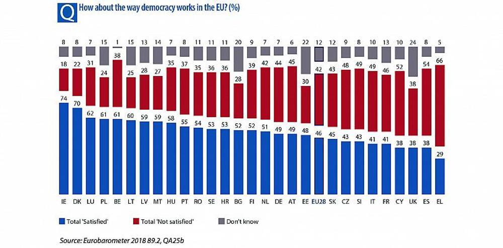 Οι Έλληνες πολίτες καταλαμβάνουν ωστόσο την τελευταία θέση ανάμεσα στα 27 μέλη της ΕΕ ως προς το ερώτημα της λειτουργίας της δημοκρατίας στη χώρα τους, καθώς μόνο το 28% εμφανίζεται ευχαριστημένο από τη λειτουργία των εγχώριων θεσμών, έναντι ποσοστών όπως 91% των Δανών ή το 85% των Λουξεμβουργιανών που δηλώνουν ικανοποιημένοι από τη λειτουργία της δημοκρατίας στη χώρα τους.