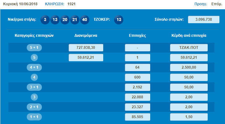Το βράδυ της Κυριακής (10/06) οι τυχεροί αριθμοί ήταν οι: 3, 13, 20, 21, 40 και Τζόκερ ο αριθμός 13.