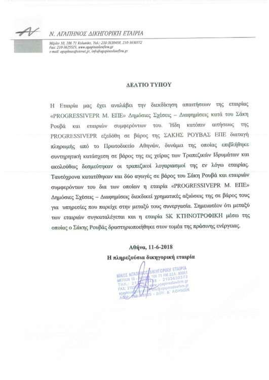 Η Εταιρία μας έχει αναλάβει την διεκδίκηση των απαιτήσεων «PROGRESSIVEPR M.EΠΕ» Δημόσιες Σχέσεις – Διαφημίσεις κατά του Σάκη Ρουβά και εταιριών συμφερόντων του. Ήδη κατόπιν αιτήσεως της «PROGRESSIVEPR M.EΠΕ» εξεδόθη σε βάρος της Σάκης Ρουβάς ΕΠΕ διαταγή πληρωμής από το Πρωτοδικείο Αθηνών, δυνάμει της οποίας επιβλήθηκε συντηρητική κατάσχεση σε βάρος της εις χείρας των τραπεζικών ιδρυμάτων και ακολούθως δεσμεύθηκαν οι τραπεζικοί λογαριασμοί της εν λόγω εταιρίας. Ταυτόχρονα κατατέθηκαν και δύο αγωγές σε βάρος του Σάκη Ρουβά και εταιριών συμφερόντων του δια των οποίων η Εταιρία «PROGRESSIVEPR M.EΠΕ» διεκδικεί χρηματικές αξιώσεις της σε βάρος τους για υπηρεσίες που παρείχε στη μεταξύ τους συνεργασία. Σημειωτέον ότι μεταξύ των εταιριών συγκαταλέγεται και η εταιρία SK Κτηνοτροφική μέσω της οποίας ο Σάκης Ρουβάς δραστηριοποιήθηκε στον τομέα της πράσινης ενέργειας.