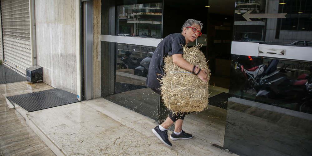 «Όπως εσείς μας ταΐζετε σανό τόσο καιρό, έτσι και εμείς σας φέραμε λίγο» είπαν κατά τη διάρκεια της διαμαρτυρίας τους για την πολιτική που εφαρμόζει το κόμμα του Πάνου Καμμένου , οι δύο «ακτιβιστές».