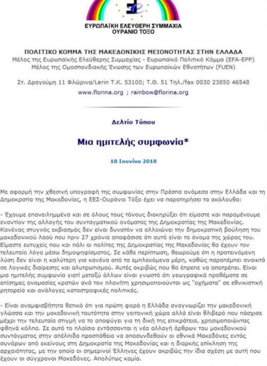 «Κανένας στυγνός εκβιασμός δεν είναι δυνατόν να αλλοιώνει την δημοκρατική βούληση του μακεδονικού λαού που πριν 27 χρόνια αποφάσισε ότι αυτό είναι το όνομα της χώρας του. Είμαστε ευτυχείς που και πάλι οι πολίτες της Δημοκρατίας της Μακεδονίας θα έχουν τον τελευταίο λόγο μέσω δημοψηφίσματος» τονίζεται στη σχετική ανακοίνωση στην οποία επισημαίνεται: «Ενεργούμε ως Έλληνες πολίτες που επιδιώκουν μέσω των μειονοτικών δικαιωμάτων που μας στερεί το ελληνικό κράτος, να συμβάλλουμε στον εκδημοκρατισμό του».